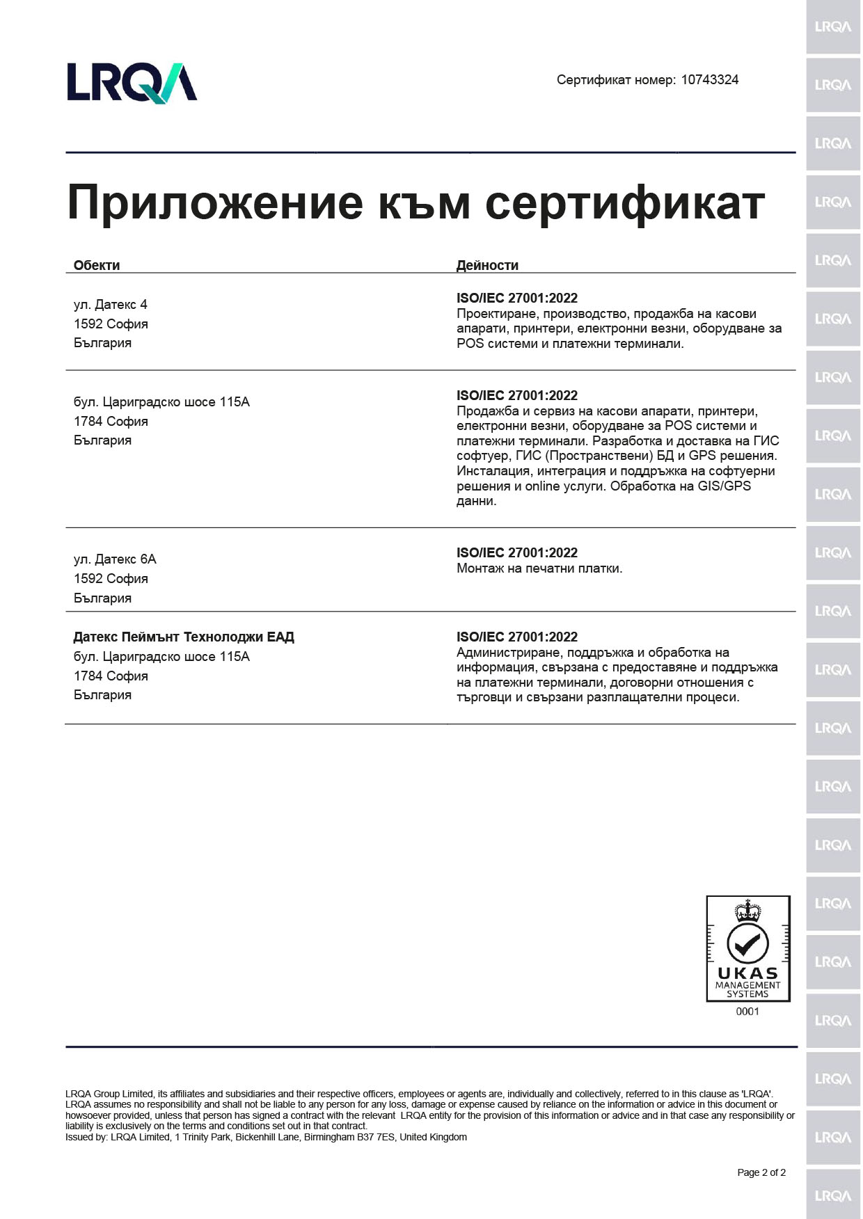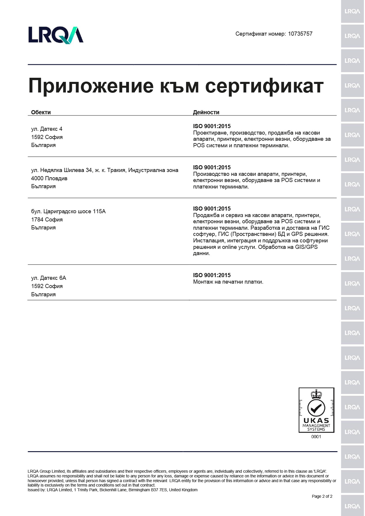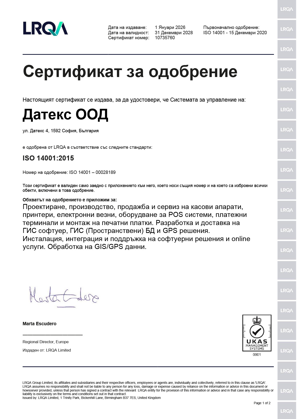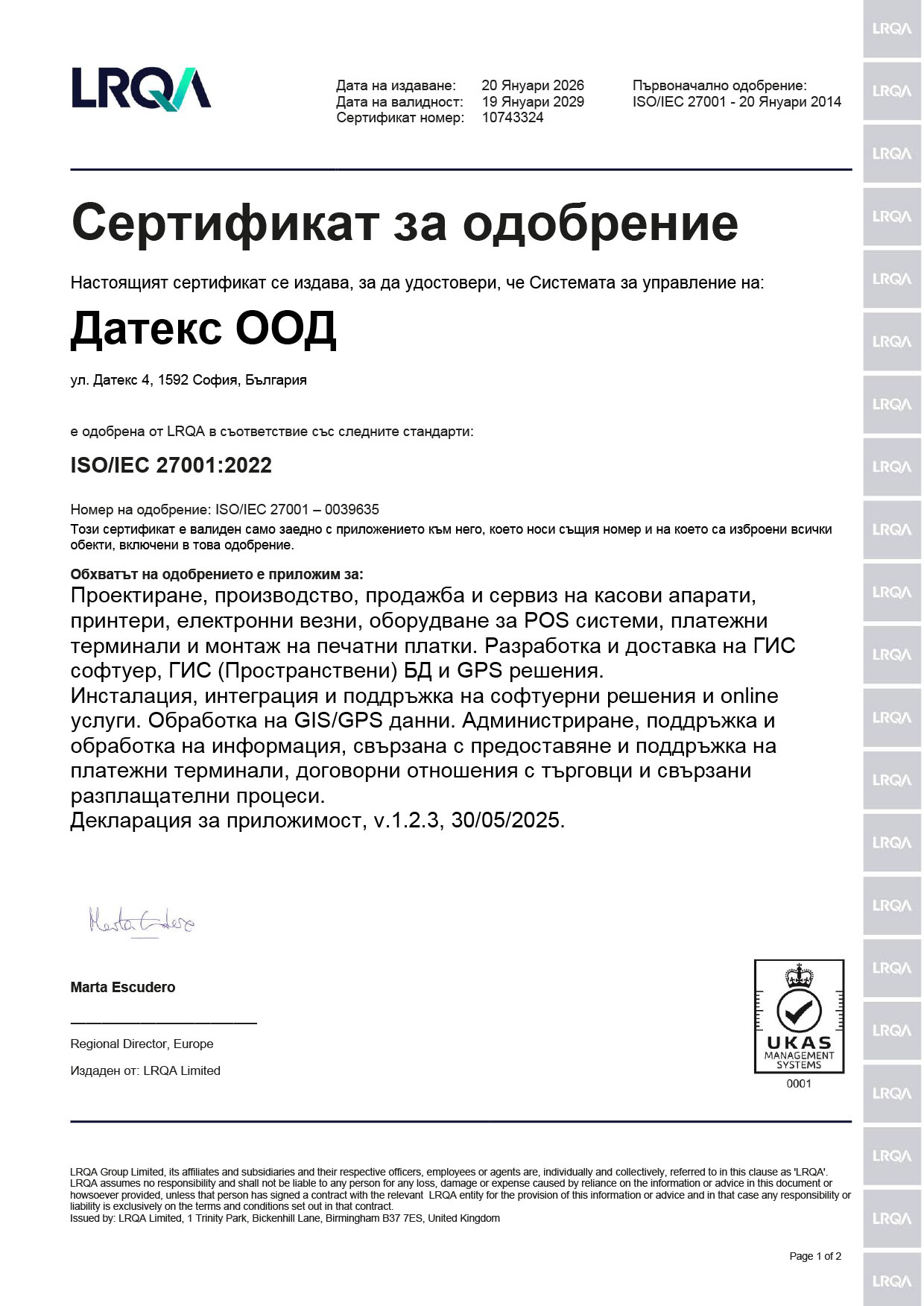 В стремежа към съвършенство, през 2001 Датекс разработва и въвежда Система за тотално управление на качеството, отговаряща на стандарта ISO 9001:2000. В края на 2001г. ДАТЕКС покрива изискванията на стандарта ISO 9001:2000 и преминава успешна сертификация. От тогава, тази система е неотделна част от разработването и производството на нашите продукти.